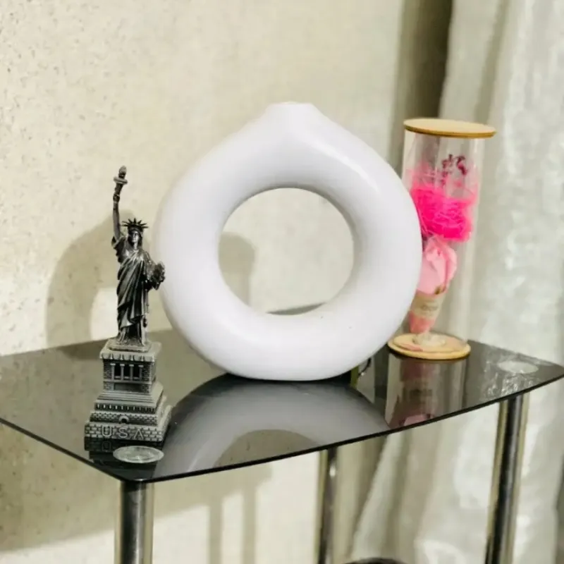 This unique donut-shaped vase is designed to add a touch of elegance to your living room decor. Its modern and minimalist design complements any interior style. Perfect for holding flowers or as a standalone decorative piece, this vase is crafted from high-quality material that ensures durability. It is an ideal accent piece for your living space, offering both form and function in one stylish design.