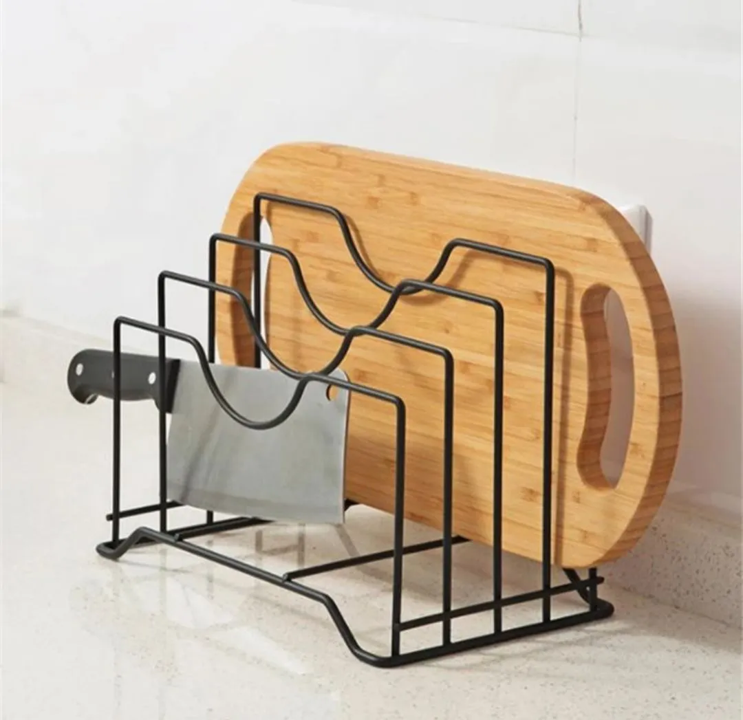 This pot lid stand is a heavy-duty kitchen accessory designed to organize your kitchen plates, pot lids, and other kitchen items. Made of durable iron, it offers a practical solution to save space while keeping your kitchen neat and tidy. Key Features: Durable construction: Crafted from sturdy iron for long-lasting use and reliability. Space-saving design: Holds multiple plates, pot lids, cutting boards, saucepans, and more, helping you optimize kitchen space. Secure storage: Each layer features notches to securely hold pot lids and other items in place. Compact size: Easy to store when not in use, saving valuable counter space. Smooth, safe surface: Designed with a smooth and even surface to protect you from injuries. Versatile usage: Ideal for holding various kitchen items like dishes, pots, and cutting boards. This pot lid stand is the perfect solution for organizing your kitchen. Its heavy-duty iron construction and space-saving design make it a must-have for any home cook. A great gift for housewarming parties or anyone looking to keep their kitchen organized.